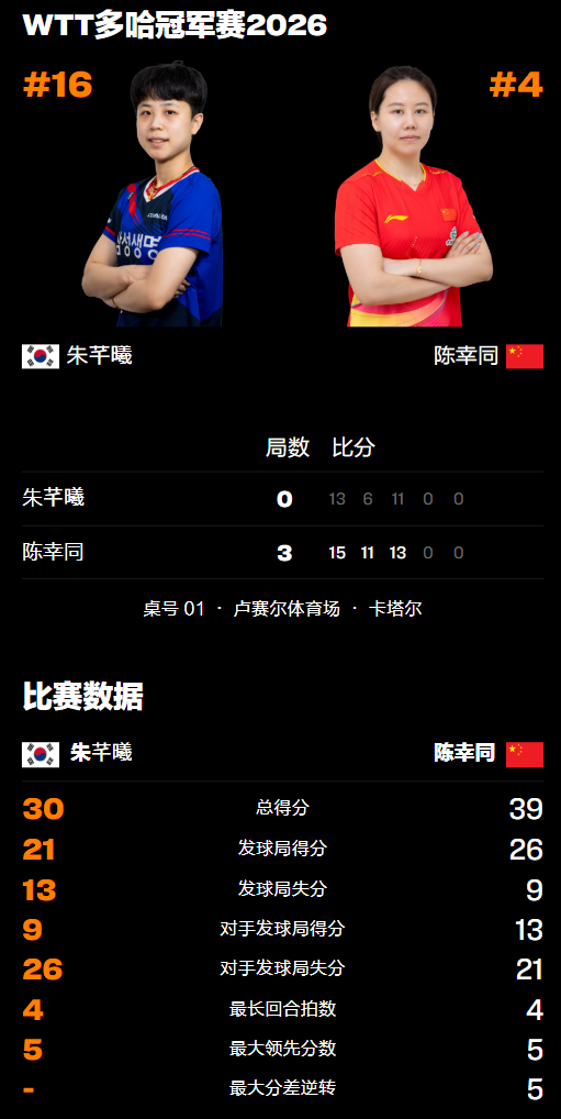 比赛开始后,陈幸同在首局迅速发动连得3分,从前三板开始就不断限制朱芊曦的发挥,打出了不错的状态,但随后对手也强势反击连赢3球追平,随后两人你追我赶,均有取得过领先的优势,陈幸同在9-10、10-11、11-12落后的情况下挽救局点追平,随后12-13再次落后韩国队叫出暂停进行调整,结果并未能阻挡国乒选手追分的脚步,最终陈幸同以15-13逆转拔得头筹。
