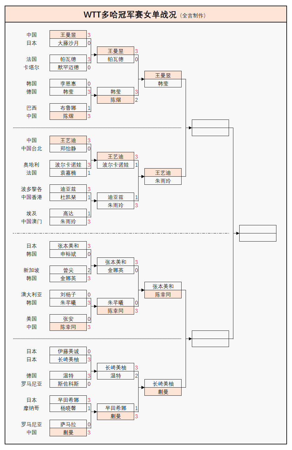 - 4/4区:长崎美柚(日本)3-2温特(德国),蒯曼(中国)3-1早田希娜(日本)。